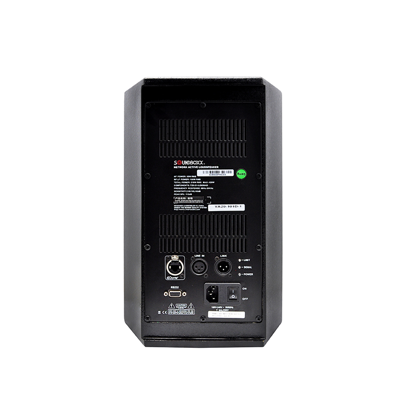 音箱具有网络输入端口和备份模拟输入输出端口,可在PC端对音箱的工作温度、电压、电流进行监测控制,并可实现DSP信号处理。
